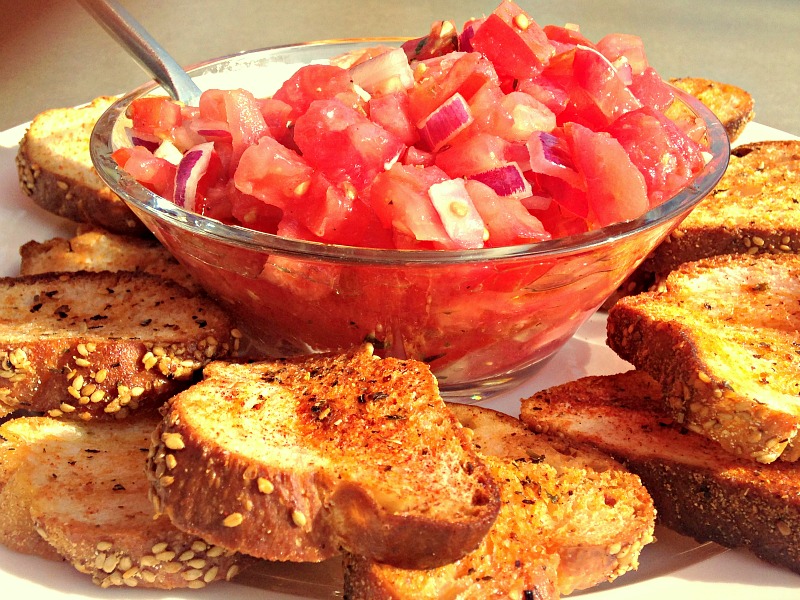 If you are currently living in a pond or in a fallout shelter and have never heard of bruschetta, it’s an Italian antipasto made with sliced, crusty bread, rubbed with fresh garlic and grilled until golden brown.